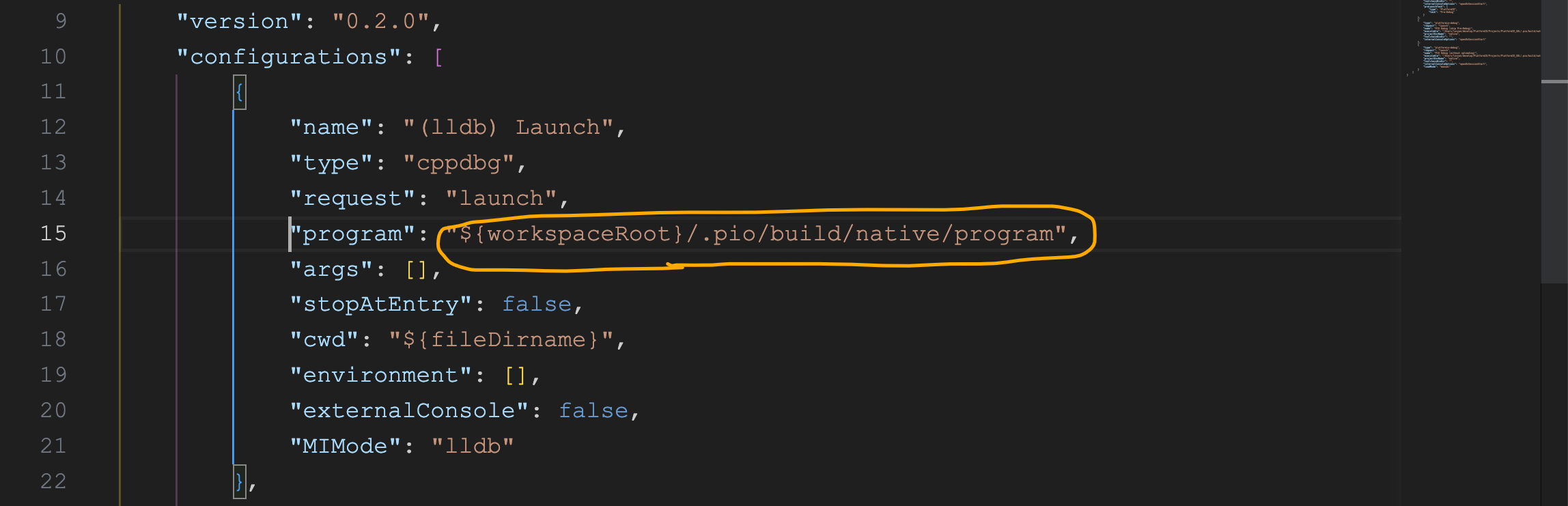 Rewrite the "program" : "${workspaceRoot}/.pio/build/native/program"